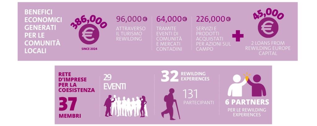 Accanto a questo, il rewilding diventa anche esperienza. Grazie ai programmi di Rewilding Experiences , sviluppati insieme a partner internazionali per far conoscere e vivere il rewilding a visitatori provenienti da tutto il mondo, abbiamo realizzato 32 tour, accolto 131 partecipanti e generato 96.000 euro. Esperienze che vanno oltre il “semplice turismo”, durante le quali coinvolgiamo sempre i membri della nostra rete di imprese per la coesistenza, oggi composta da 37 realtà, che contribuiscono a offrire esperienze autentiche: dall’ospitalità al cibo, dagli incontri tematici alle attività sul territorio. Un modo concreto per dare voce e sostegno a chi, più di chiunque altro, sa raccontare e rappresentare questi luoghi.