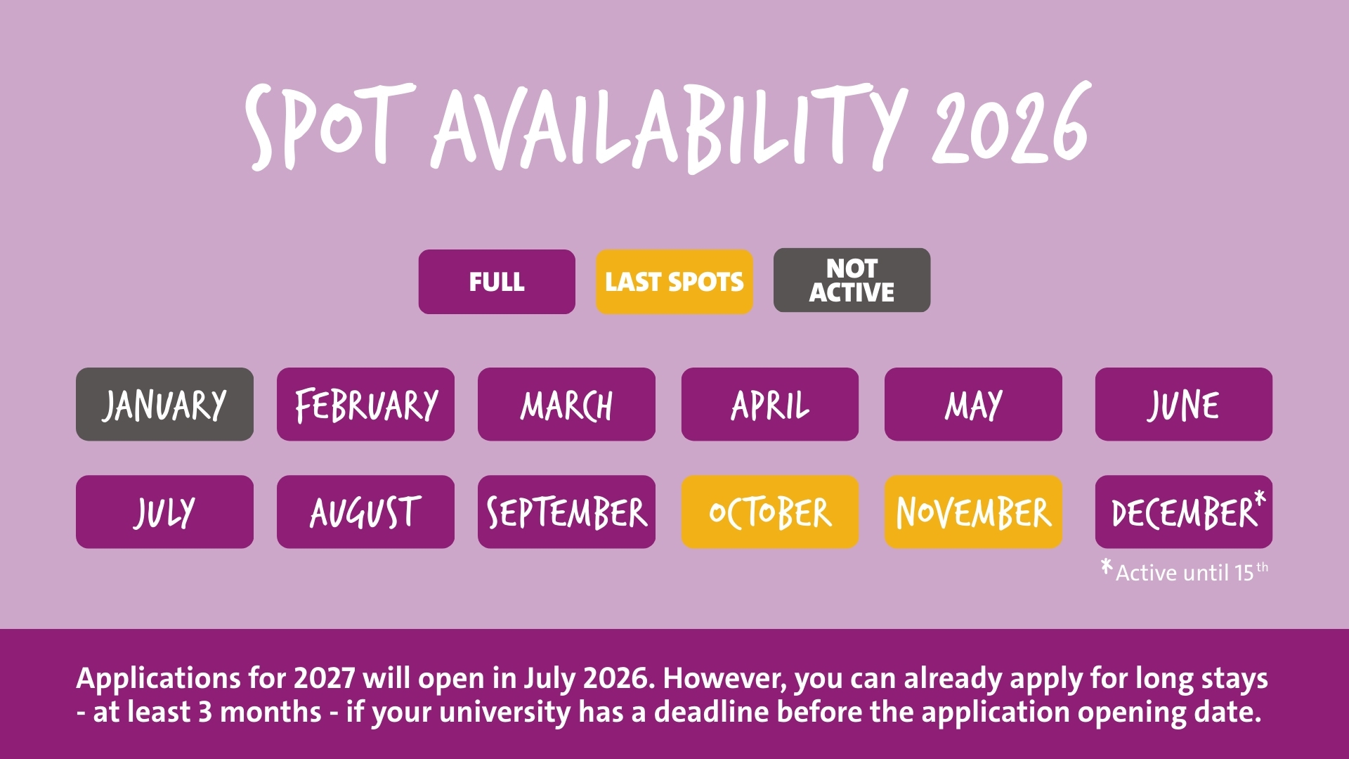 Diamo in generale priorità ai volontari che possono rimanere per diversi mesi. Per esempio, se ti candidi per un solo mese, la tua candidatura potrebbe avere meno probabilità di essere selezionata.