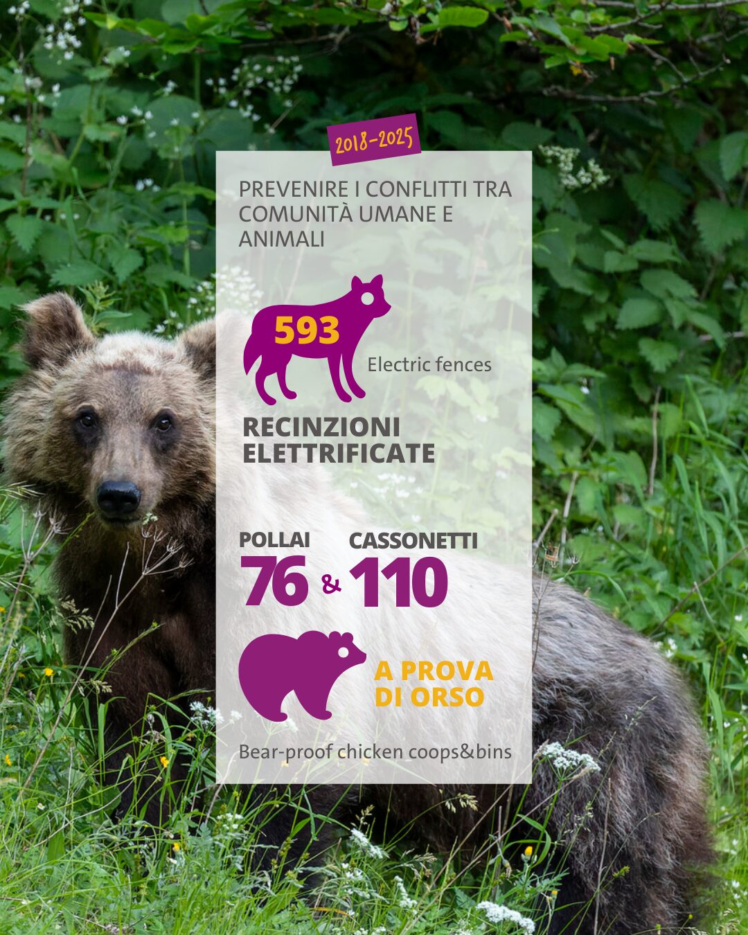 In 2025, we installed 80 electric fences, 53 bear-proof bins and reinforced 5 henhouses. These tools are essential for reducing damage, preventing conflict and avoiding bears becoming accustomed to human presence. Together with interventions carried out in previous years, this brings the total to 779 interventions overall.