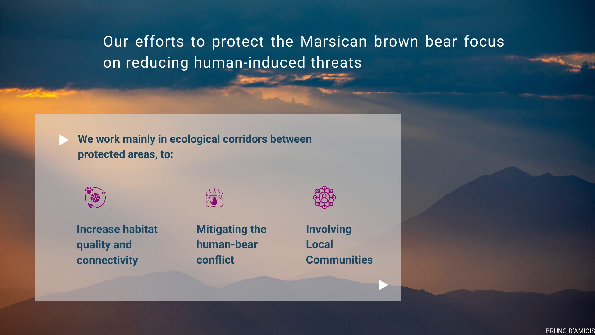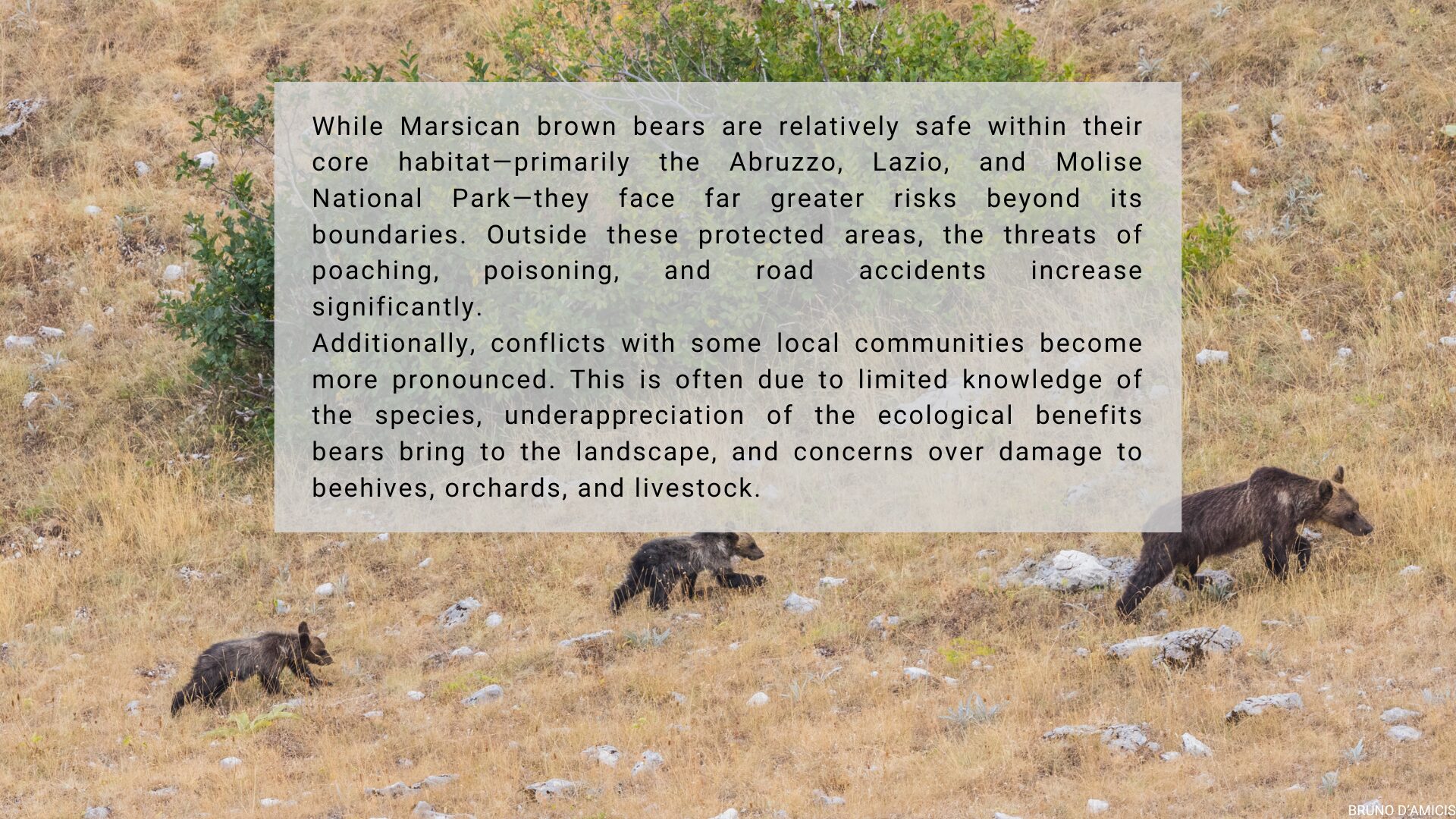 Wildlife in the Central Apennines is at risk from poaching, poisoning, road accidents, habitat fragmentation, and human disturbance. For some species, these dangers are so severe that their very survival hangs in the balance. The Marsican brown bear, for example, has such a small population that the loss of just a few individuals could jeopardize the entire species.