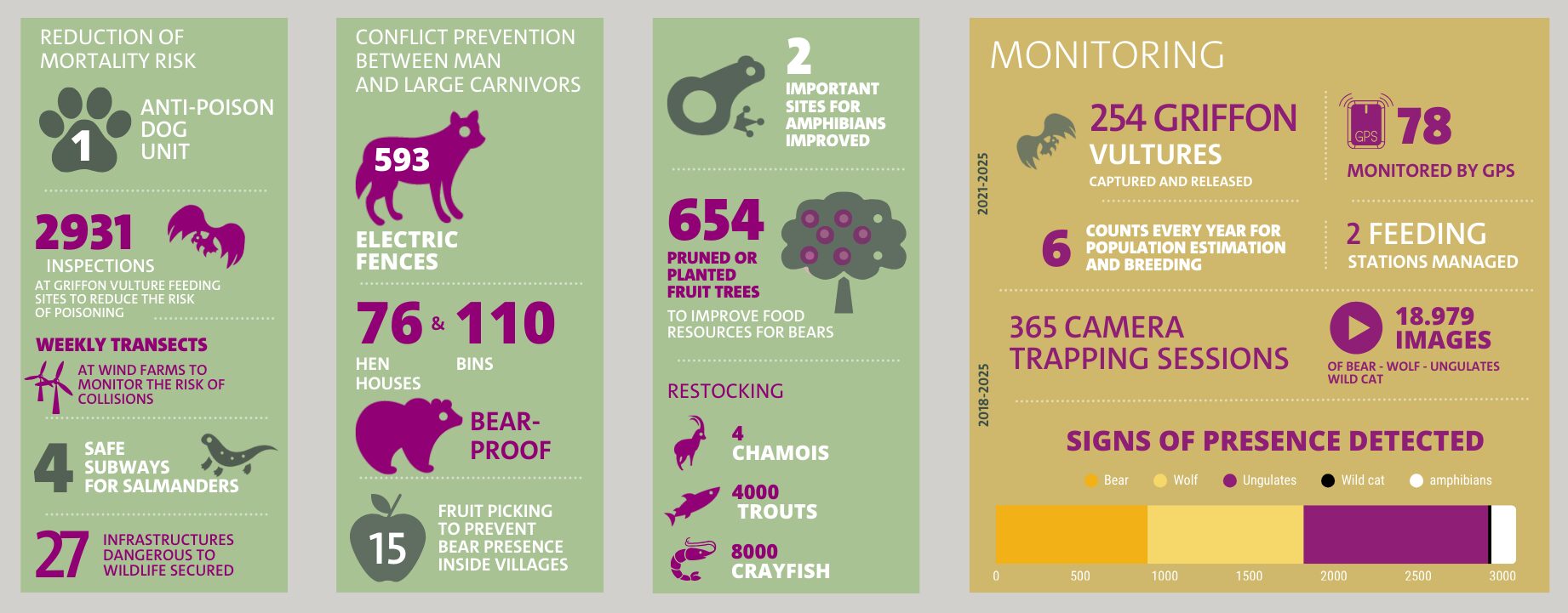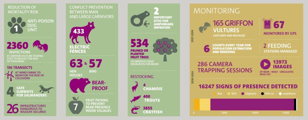 We also focus on species that can generate conflicts with human activities, like the wolf, implementing prevention strategies to foster harmonious coexistence. Additionally, we dedicate resources to the study and protection of elusive, hard-to-monitor species, such as the wildcat.